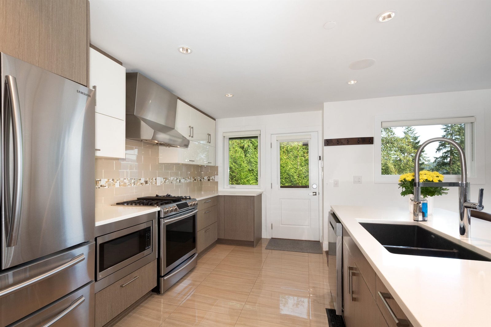 Amazing views; better than new house! Welcome to this spectacular top quality rebuilt home. Hidden up off the road, this home has ALL the extras. Drive up to your gated property and enjoy ocean/mountain views to the front; exclusive Quarry Rock trail access in back. Multi-level home w/ luxurious finishes and windows everywhere. High and bright open plan, w/ 3 bedrooms + den (4th bedroom?) up; suite and beautiful rec room down. Rare extras include A/C, auto blinds, smart lights/sound. Decks everywhere to enjoy the amazing sunny south facing outlook. Tons of parking; EV charger; workshop; lots of storage. Don't like stairs? Get out of your car and hop into the elevator. So many extras; too many to list. Walk to shops, restaurants, schools.
